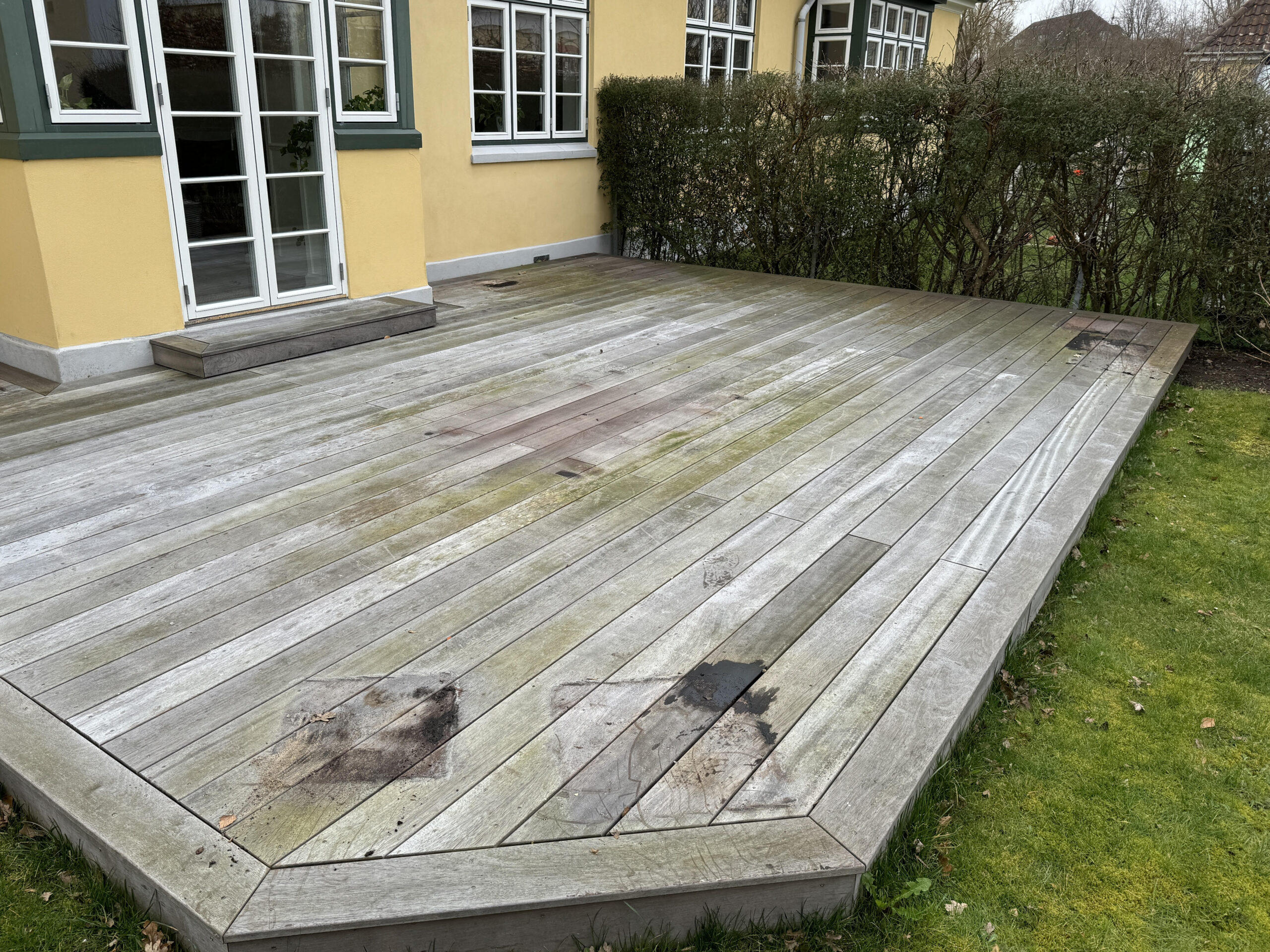 Med højtryksrenser fjerner vi alger og alt snavs, hvilket foregår under kontrolleret højtryk for at træterrassen ikke bliver beskadiget. Samtidig bruger vi også en overfladerenser for at opnå et jævnt resultat hele vejen igennem.